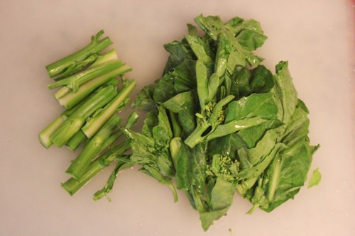 1. Separate the Chinese broccoli sterns from the leaves. Cut the stems in half lengthwise