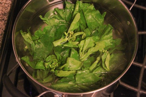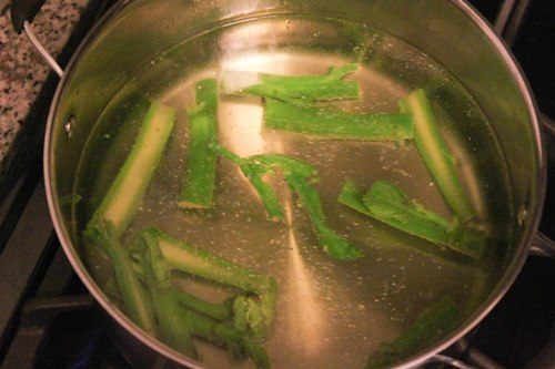 3. Blanch the sterns separately in the same pot of boiling water for about 2 minutes until the sterns are tender crisp. Remove and drain in the colander. Place on top of the blanched leaves