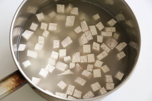 - In another cooking pot, combine the taro with 2 cubs of cold water and bring to boil. Continue to cook the taro over medium heat until the taro cubes become soft. The total cooking time is about 9 minutes or until the cubes are cooked through