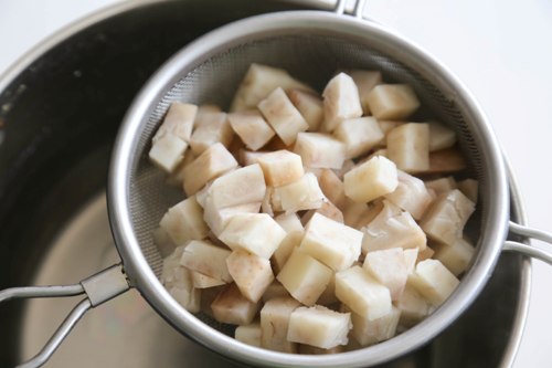 - Transfer the cooked taro to a mesh strainer and drain off the liquid