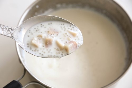 - Add cooked tapioca and taro to the coconut milk mixture and stir to mix. Chill the mixture in the fridge for at least 1 hour before serving. The tapioca pudding is best served cold and you can store the extra in the fridge for up to 3 days