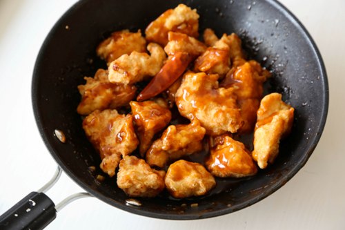 - In a frying pan, heat up the pre-cooked sauce over high heat. Add fried chicken and toss until all chicken pieces are coated. Plate the chicken. Sprinkle toasted sesame seeds for garnish if serving as sesame chicken
