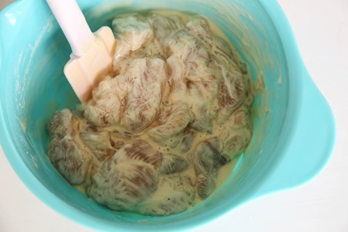 - Add the marinated chicken to the batter. Gently fold the chicken to ensure each piece is coated with batter