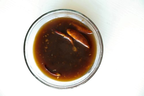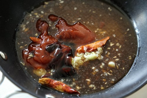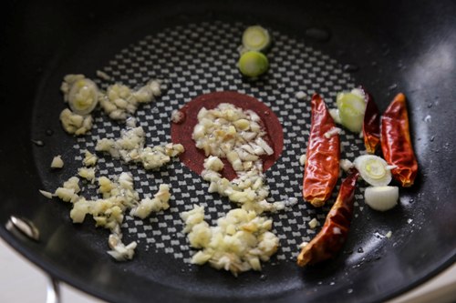 - For the sauce, heat up a frying pan and add 1 tbsp of cooking oil. Stir fry garlic, ginger, scallion, and dried chili until aromatic. About 2 minutes