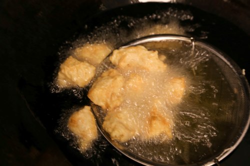 - Heat up frying oil in a wok or heavy skillet. Test the frying oil to make sure it’s hot enough. Fry the battered chicken pieces in small batches until they urn golden brown. About 5 - 6 minutes