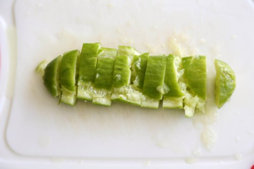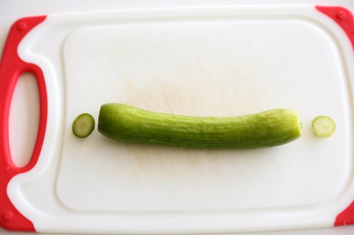 1. Rinse and dry the cucumbers. Place a cucumber on cutting board and remove the ends