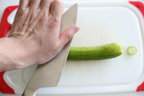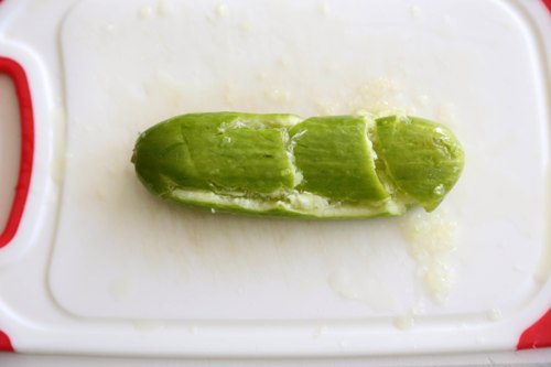 2. Please your knife against the cucumber and apply force on knife blade to smash the cucumber