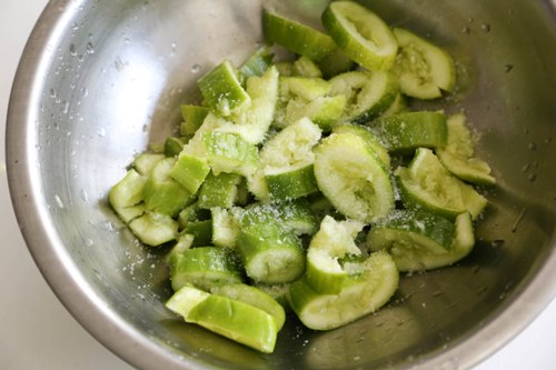 6. Once the cucumbers are slightly wilted, remove as much liquid as possible