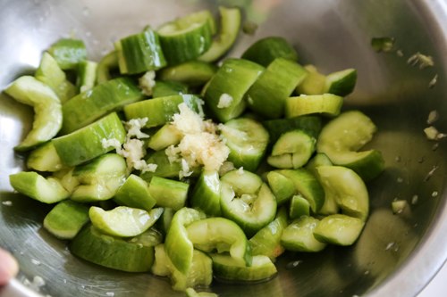 7. Add grated garlic, sesame oil, and additional salt and toss to mix. Alternatively, you can dress the cucumbers with this garlic vinegar dressing recipe I shared a while ago